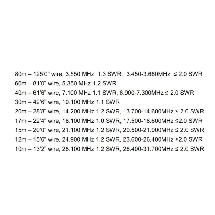 Designed to be used without a tuner to give an SWR of ≤2.0 for any portion of the band after optimizing the driven element. For 80m the cable length can be optimized for the upper or lower portion of the band.