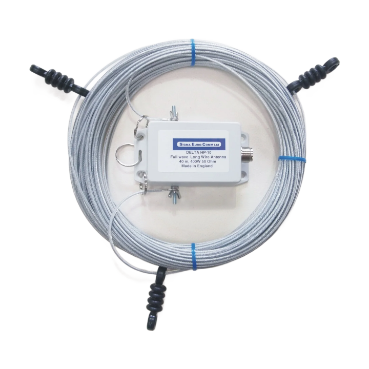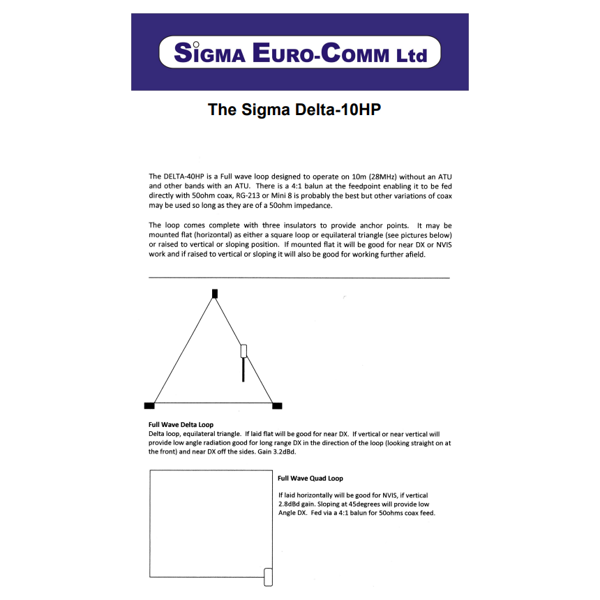 The DELTA 10-HP is a Full Wave Loop designed to operate on 10 m (28 MHz) without an ATU and other bands with an ATU. There is a 4:1 balun at the feedpoint enabling it to be fed directly with 50 ohm Coax.