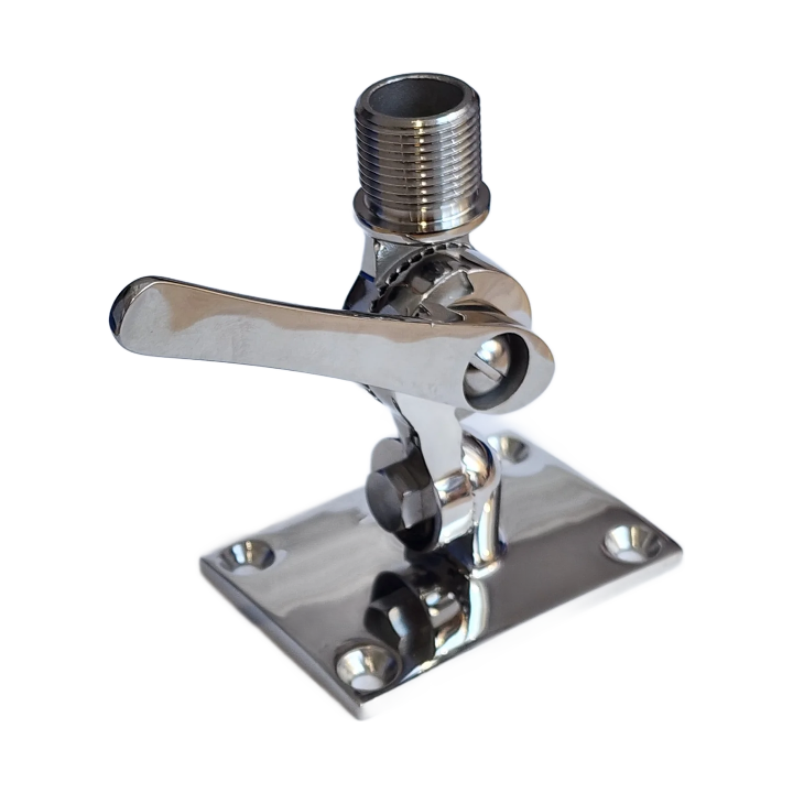 This top quality polished 316 stainless steel marine heavy duty antenna base with dual swivel adjustability is built to last and is ideal for longer marine antennas.