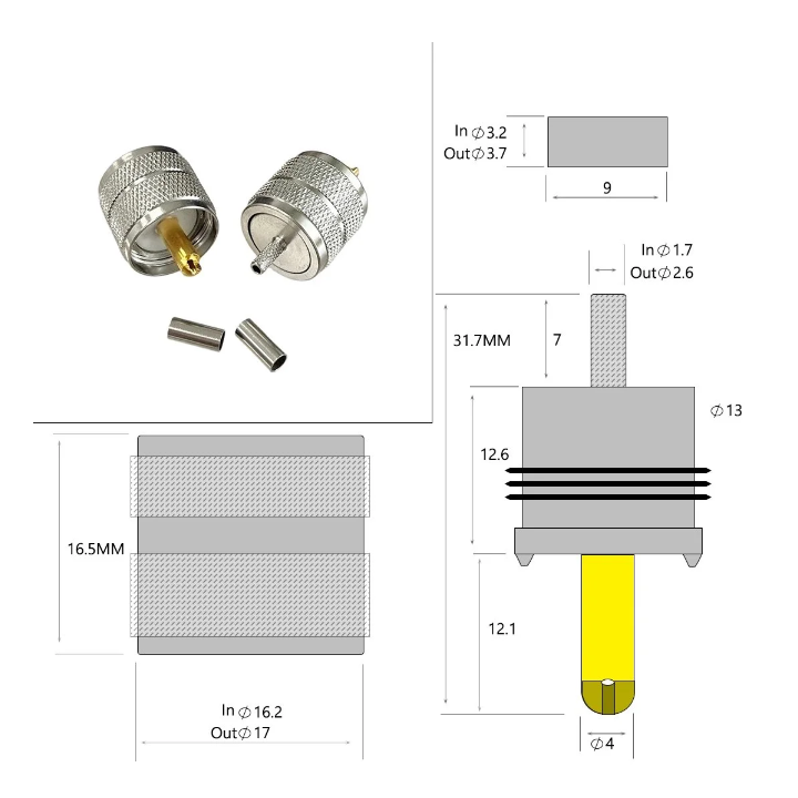 PL259 radio antenna plug connector. Will require crimping tool plus soldering iron to fit and heatshink (suggested).