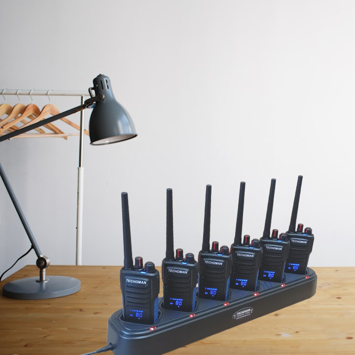 6 ALL TERRAIN RAIN-PROOF SERIES TECHOMAN 168 CHANNEL UHF CB WALKIE TALKIES - 5 WATTS MAX TRANSMIT & BIG 2000 mAh BATTERIES (STANDARD OR USB-C CHARGE OPTIONS) AND 6-WAY CHARGER