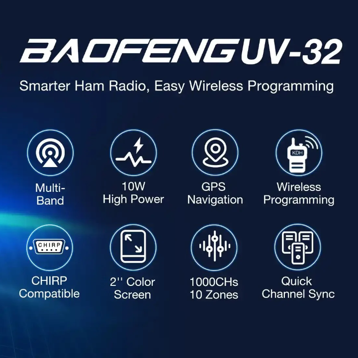 Equipped with GPS positioning and a radar-style display, the UV-32 helps you track your location - perfect for hiking, camping, and search & rescue. Setup is simple with Bluetooth app programming or CHIRP software, making it user-friendly for beginners and flexible for experienced hams. A 2.0" colour screen, customizable side keys, and quick channel knob provide intuitive control, while the 2500mAh USB-C rechargeable battery ensures dependable all-day use. Compact yet powerful, the UV-32 is more than just a radio - it’s your ultimate tool for communication, safety, and preparedness.